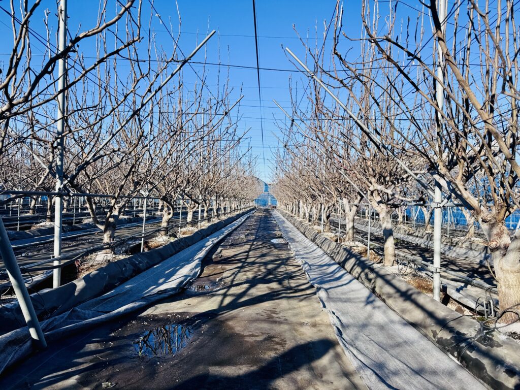 住宅地に隣接する農地で、いかに効率よく、安全に果物を育てるか。その答えの一つが、園全体に張り巡らされたこのシステムでした。梨の木一本一本を管理し、水や肥料を自動で最適化する「根域制限栽培」という最先端技術です。