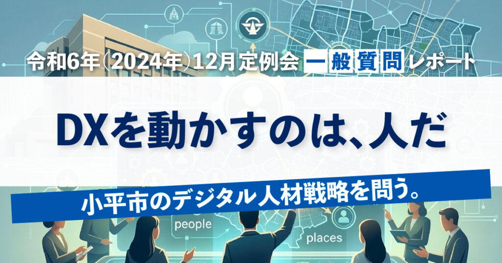 令和6年(2024年)12月定例会 一般質問「デジタル政策参与、DX推進人材について問う」レポート このレポートの要約 令和6年12月定例会では、小平市のDX推進を支える「人材」に焦点を当て、デジタル政策参与の活動実態とDX推進リーダーの育成・配置の現状を問いました。 デジタル政策参与の実態確認:8か月間で12回登庁、週次オンライン定例29... -