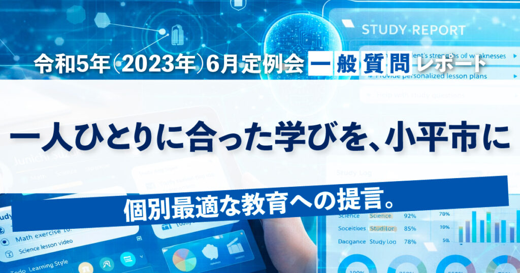 令和5年(2023年)6月定例会 一般質問「個別最適な学びの実現に向けた取組の推進を」レポート このレポートの要約 令和5年6月定例会では、GIGAスクール構想の「次」を見据え、個別最適な学びの実現を議会で問いました。 GIGAスクール構想の進捗と課題:1人1台端末が整備された一方、「配って終わり」になっていないか。2023年当時の小平市の... -