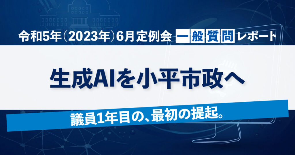 令和5年(2023年)6月定例会 一般質問「業務及び市民サービスへのAI技術の活用について」レポート このレポートの要約 令和5年6月定例会では、議員として初めての一般質問に臨み、小平市の行政における生成AI活用をテーマに議会で問いました。 なぜ、議員1年目に生成AIを選んだか:2023年春、ChatGPTが世界を席巻する中、科学者・研究者とし... -